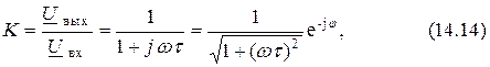 Модуль коэффициента передачи (АЧХ) плавно уменьшается от единицы до нуля (рис. 14.11, б), а фаза – от нуля до