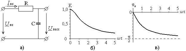 -цепь (а) и её амплитудно-частотная (б) и фазочастотная (в) характеристики коэффициента передачи по напряжению