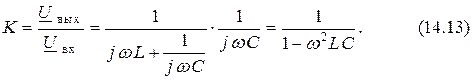 Модуль коэффициента передачи имеет максимум в бесконечности на резонансной частоте (рис. 14.10, б), а фаза на этой частоте скачком изменяется на