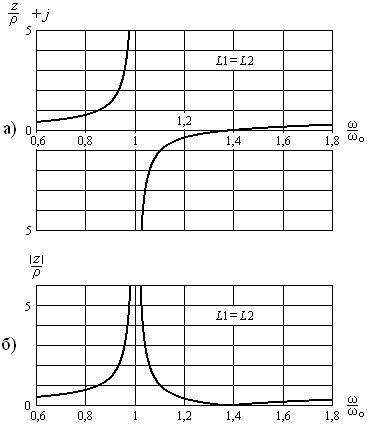 Рис. 16.8. Частотные зависимости сопротивления (а) и модуля сопротивления (б) идеального параллельного колебательного контура с двумя индуктивностями