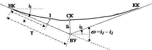 Детальная разбивка вертикальных кривых ведется способом прямоугольных координат. Задаваясь х от НК=ВУ-Т, вычисляют проектную отметку разбиваемой точки 1: Н1=ННК+i x ± x2/ (2R), с плюсом для вогнутых кривых, с минусом для выпуклых кривых. Аналогично вычисляют для точек от КК.