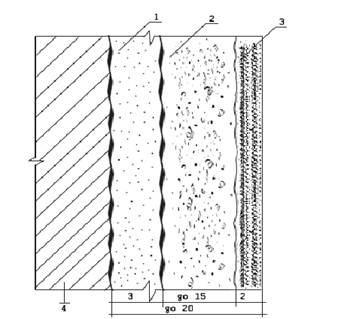 Рис. Сечение стены с высококачественной штукатуркой: 1-обрызг; 2-грунт; 3-накрывка; 4-кирпичная стена