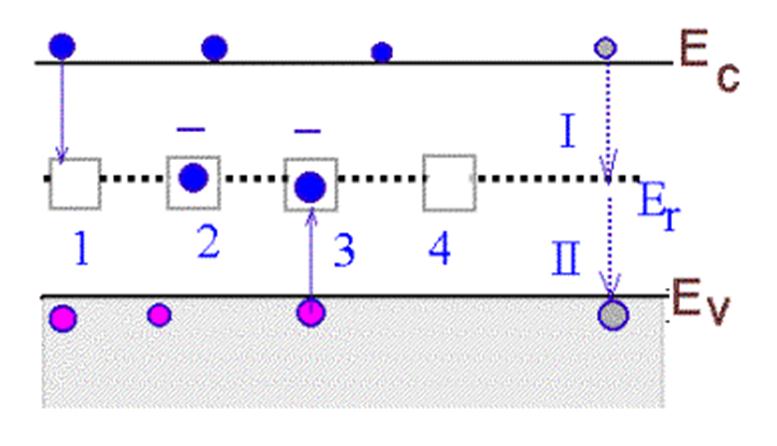 Практически рекомбинация электронов и дырок происходит с участием ловушек, энергетические уровни которых находятся в запрещенной зоне полупроводника.