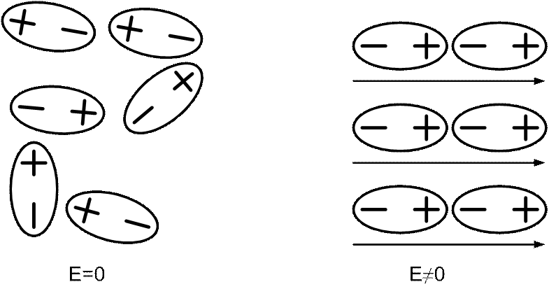 Дипольная поляризация характерна для полярных диэлектриков, молекулы которых представляют собой твердые диполи, электрические моменты которых ориентированы произвольно.