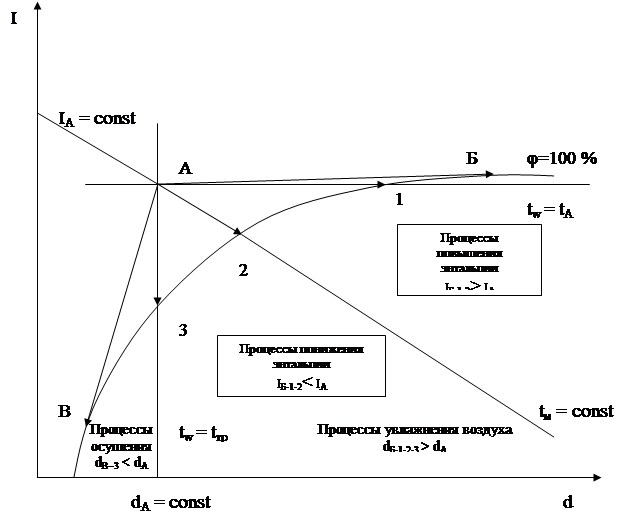 Возможные направления процессов взаимодействия воздуха с водой представляются линиями, расположенными в области криволинейного треугольника АБВ, у которого одной стороной является кривая φ =100 %, а двумя другими – касательные к этой кривой проведенные из точки А, характеризующей начальное состояние воздуха. В зависимости от температуры воды процессы взаимодействия воздуха и воды изображаются линиями, расположенными в различных областях, отделенных характерными линиями (см. рисунок 8.4):