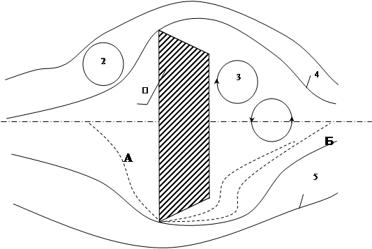 1 – пластина; 2 – элементарная струйка воздуха; 3 – вихревое движение воздуха в зоне аэродинамического следа; 4 граница аэродинамического следа; 5 – линии тока в зоне аэродинамического следа; А и Б – точки торможения (положение точек не фиксировано).