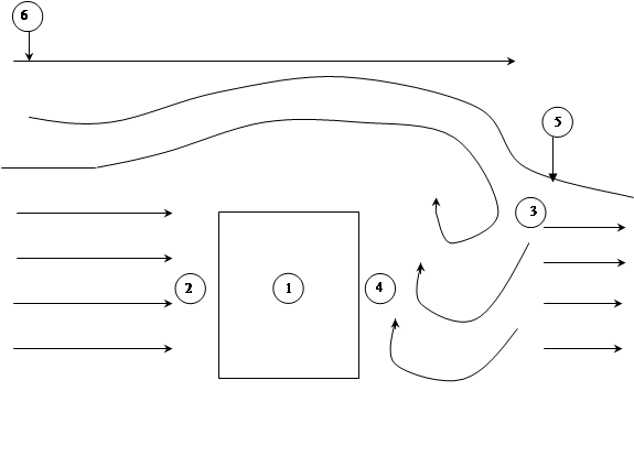 1 – здание; 2 – зона избыточного давления; 3 – зона разрежения; 4 – зона возникновения обратных потоков; 5 – граница зоны аэродинамического следа; 6 – граница зоны влияния здания на поток воздуха