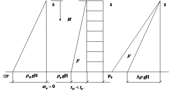 б) внутри здания эпюра давления имеет вид трапеции, где Ро – избыточное давление относительно условного нуля (внутреннее статическое давление) (см. рисунок 13.3б);
