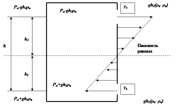 Если в стенах здания, находящегося в среде неподвижного воздуха, имеются два отверстия – одно внизу F1 и другое вверху F2, то при условии, что температура воздуха снаружи tн, а внутри здания поддерживается равной tв (причем tв>tн), воздух будет поступать через нижнее отверстие и уходить через верхнее (рисунок 9.4). Для этого необходимо, чтобы давление на уровне нижнего отверстия было снаружи выше, чем внутри, а на уровне верхнего – наоборот. Т.к. напор по высоте здания изменяется по линейному закону, то между отверстиями должна быть плоскость, на уровне которой разность давлений равна нулю. Эту плоскость называют нейтральной или плоскостью равных давлений.