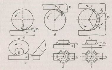 а — цилиндрическое со встречной подачей; б — цилиндрическое с попутной подачей; в — цилиндрическое пазовое; г — коническое; д — торцовое; е — торцово-коническое