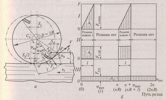 Ввиду малости отношения скоростей у/у, взятых в одной размерности, различие между абсолютной траекторией резания (циклоидой) и окружностью резания невелико. Поэтому для упрощения формул можно с некоторой погрешностью (до ±3 %) принимать траекторию, описываемую кончиком резца в древесине, заокружность радиуса R