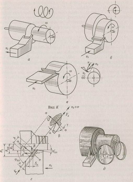 Поперечное точение имеет две разновидности: радиальное и тангенциальное. Радиальное точение получается при подаче резца перпендикулярно оси вращения по направлению радиуса (см. рис. 35, б). Абсолютная траектория точки лезвия резца в древесине представляет собой архимедову спираль; расстояние между витками спирали — толщина срезаемого слоя, мм, величина постоянная; а = 1000у.;/п, где п — частота вращения заготовки, мин~1.