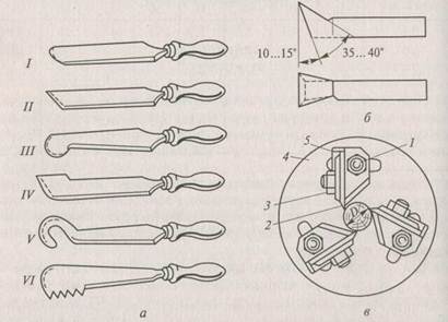 Рис. 36. Режущий инструмент для точения древесины: а - токарные ручные резцы: /—с полукруглым лезвием для чернового точения II — с прямым лезвием для чистового точения; III—VI — для фигурного точения; б — токарный станочный проходной резец для чистового точения; в - ножевая головка круглопалочного станка; 1 и 3 — болты; 2 — нож; 4 — корпув 5 — резцедержатель