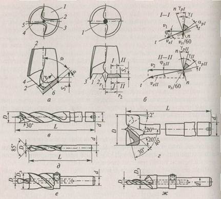 а — для продольного; б — для поперечного сверления; в—ж— конструкцю сверл и зенкеров