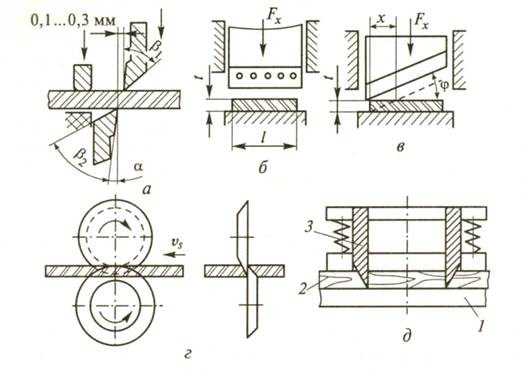 а — общая схема; б — параллельным ножом; в — наклонным ножом; г — дисковыми ножницами; д — штампование просечкой с прижимом