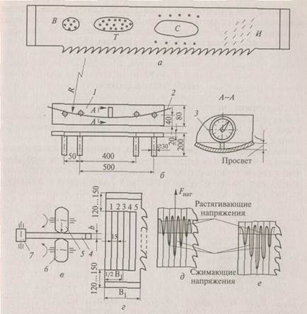 а — местные дефекты полотна и порядок ударов при правке; б — контроль напряженного состояния полотна; вальцевание рамных пил; в —принципиальная схема: г — расположение следов вальцевания; д — распределение напряжений в пиле после вальцевания и натяжения пилы; е — распределение напряжений в пиле после вальцевания