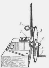 коренной шайбы 7. Для этого на поверхность коренной шайбы и ножку индикатора накладывают поверочную линейку. Нулевую отметку циферблата подводят к большой стрелке индикатора. При определении неплоскостности пилу 3 устанавливают на вал 4, зажимают шайбой 5 и медленно вращают за рукоятку 6. Величина допустимого торцевого биения (мм) составляет от 0,15 (для пил диаметром до 200 мм) до 0,6 (для пил диаметром 1600 мм).
