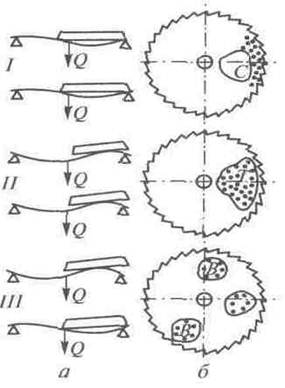 Способ правки зависит от типа дефекта. Слабые места С (/) исправляют ударами проковочного молотка с круглым бойком вокруг дефектного места, постепенно ослабляя удары по мере удаления от него. Удары наносят с обеих сторон пилы. Тугие места Т{Щ исправляют ударами проковочного молотка внутри зоны дефекта от границ к середине. Удары наносят с обеих сторон пилы. Выпучину В {III) исправляют ударами проковочного молотка со стороны выпучины. Чтобы не изменить общего натяжения полотна, между пилой, положенной выпучи-ной вверх, и наковальней помещают картонную или кожаную прокладку. Изгиб пилы (складки у зубчатой кромки, отогнутые участки кромки, горбатость и одностороннюю крыловатость диска) исправляют ударами правильного молотка (с продолговатым бойком) либо по самому хребту изгиба, либо, если размеры дефекта значительны, от краев изгиба к хребту со стороны выпуклости. Ось бойка должна совпадать с направлением оси изгиба.