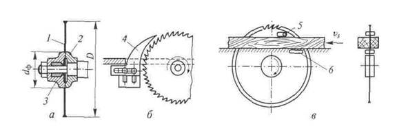 3. Для обеспечения надежного зажима пилы фланцы контактируют с пилой только наружными ободками шириной 20...25 мм. Диаметр зажимных фланцев выбирают в зависимости от диаметра пилы: й?ф = 5У7), где В — диаметр пилы, мм.