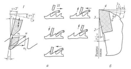 а — стальных (/ — установка круга; 77 — последовательные взаимные положения круга, зубьев и подающей собачки); б — оснащенных пластинкой твердого сплава