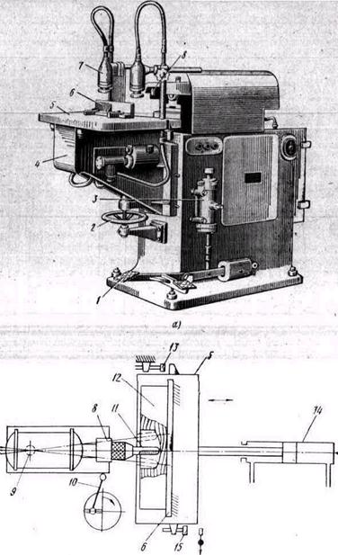 а — общий вид, б — схема paботвы, 1 — педаль, 2 — маховичок, 3 — направляющий гидрораспределитель, 4 кронштейн.. 5 — стол, 6 — упорный угольник, 7 — зажим 8 — патрон, 9 — электродвигатель, 10 — шатун. 11 — фреза, 12 — заготовка, 13, 15 — упоры системы управления, 14 — гидроцилиндр