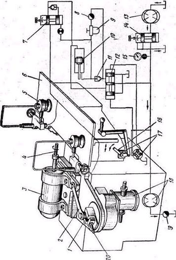 В крайнем, ближайшем к фрезе положении стола рычаг 16, закрепленный на столе, воздействует на крановый гидроаппарат 17, который переключает стол на обратный ход. При этом левая