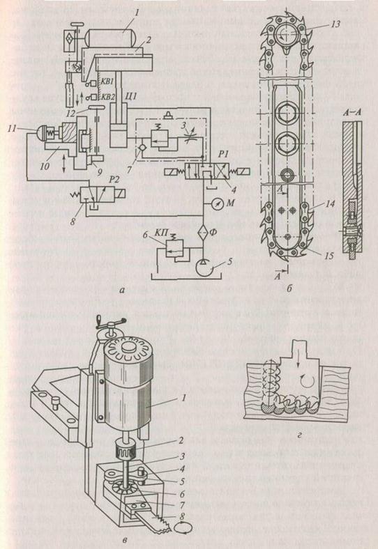 а — гидрокинематическая схема; б — режущая головка; в — долбежная головка; г — схема долбления