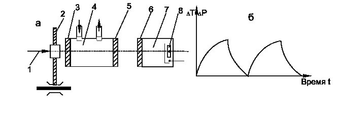 Газоанализатор состоит: из источника инфракрасного излучения 1; обтюратора 2; рабочей камеры 4; лучеприемника 7; оптически прозрачных для инфракрасного излучения окон 3, 5, 6; микрофона 8. Поток инфракрасной радиации, излучаемый источником и периодически прерываемый обтюратором с определенной частотой, сначала поступает в рабочую камеру, через которую проходит анализируемая смесь, а потом в лучеприемник, заполненный газом, концентрация которого определяется. Под действием прерывистого потока инфракрасной радиации газ в лучеприемнике будет периодически нагреваться и охлаждаться и внутри лучеприемника будут возникать периодические колебания температуры газа T, вызывающие колебания давления величиной Р (на том же рисунке – часть "б"). Амплитуда этих колебаний будет пропорциональна концентрации анализируемого газа. (чем больше концентрация, тем большая часть радиации поглощается в рабочей камере, тем меньше будет амплитуда колебаний.