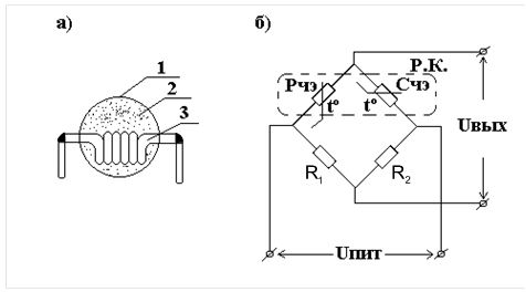 На приведенном ниже рисунке изображен чувствительный элемент (часть рисунка "а") и общая мостовая схема первичного преобразователя, термохимического газоанализатора (часть "б").