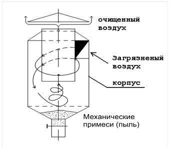 Частицы пыли за счет центробежных сил отжимаются на внутреннею боковую поверхность корпуса и сползает вниз — в бункер, откуда периодически удаляется. В циклоне можно удалить довольно мелкую пыль (15¸20 мкм). Чем больше размер пыли, тем больше степень очистки. Степень очистки циклонов достигает 95%.