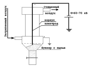 В электрофильтре происходит явление коронивания на электроде (свечение), при этом воздух ионизируется. Отрицательные ионы (газа и пыли) движутся от электрода к корпусу, отдавая свой заряд корпусу. Пыль оседает на внутренней поверхности корпуса и сползает вниз – в бункер, откуда она периодически удаляется. Кроме того, в электрофильтрах (так же как и в циклонах) для интенсификации процесса сползания пыли в бункер, по корпусу фильтра периодически постукивают.