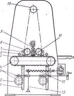 Подают щиты гусеничным конвейером 5 (см. рис. 123), выполненным из резиновых планок в виде ленты, надетой на две цепи, приводимых звездочками 4 от электродвигателя через электромагнитную муфту скольжения. Узел механизма подачи вместе с конвейером опирается на рейки, находящиеся в зацеплении с шестернями 2, закрепленными на валах вместе с червячными шестернями червячных пар 3. Червячные пары 3, действуя как реечные механизмы, поднимают механизм подачи, прижимающий шлифуемые поверхности щитов к неподвижным губкам 7 и опорным роликам 6.