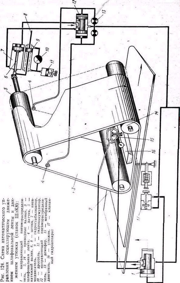 Широколейточные шлифовальные станки 'предназначены для шлифования поверхностей щитов. Основным в этой группе станков является станок ШлК8 (рис. 123) со-шлифовальной лентой, натянутой на два нижних приводных ролика 8 и верхний холостой ролик 10. Оси роликов параллельны между собой и расположены в виде треугольника. Холостой ролик служит не только для натяжения шлифовальной ленты, но и сообщает ей осциллирующее движение в процессе шлифования. Между приводными роликами помещен утюжок //, представляющий собой резиновую камеру, закрепленную на стержне 9, скользящую в направляющих. Полость камеры соединена с напорной линией. Изменяют давление в камере, настраивая редукционный клапан. Ролик 10 подпружинен и для передачи ленте осциллирующего движение снабжен пнсвмо-гидравлическим приводом также с автоматическим управлением.Система автоматического управления пневмо-