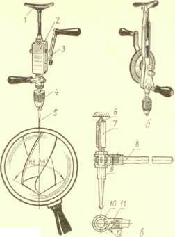 а — ручная дрель с двухступенчатой передачей (/ — упор; 2 — двухступенчатый мультипликатор; 3 — привод с рукояткой; 4 — патрон; 5 — сверло); б — ручная Дрель с открытой одноступенчатой (конической) передачей; я — трещотка (6 — упор; 7 — гайка; 8 — вильчатая рукоятка, вращающая шпиндель 9 и храповое колесо 10; II — собачка; 12 — пружина собачки).
