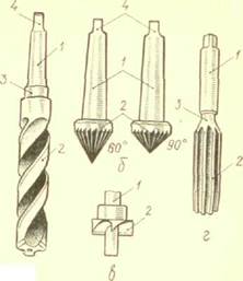 | Рис. 102 Инструменты для обработки и доводки отверстий: а — цилиндрический зенкер; б — конические (иловые) зенковки; в ~- торцовая зенковка (цекокка); г—развертка; / — хвостовики; 2 — рабочая часть; 3 — шейки; 4 — ланки. |