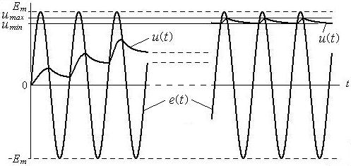 За время одного периода напряжение на ёмкости не успевает достичь своего максимального значения. Поэтому в следующий положительный полупериод волны эдс, когда диод находится в открытом состоянии, ёмкость успевает зарядиться до большей величины. Затем диод запирается и начинается новый разряд ёмкости через сопротивление нагрузки. Процесс заряда-разряда продолжается непрерывно, пока в цепи действует эдс.