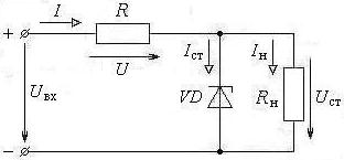 в схеме включают в обратном направлении относительно полярности входного напряжения, так как рабочей является обратная ветвь ВАХ стабилитрона. Сопротивление нагрузки