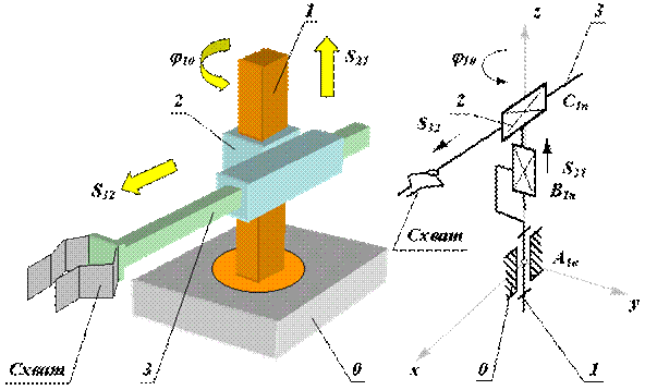 Рассмотрим для примера структурную и функциональную схемы промышленного робота с трехподвижным манипулятором. Основной механизм руки манипулятора состоит из неподвижного звена 0 и трех подвижных звеньев 1, 2 и 3:
