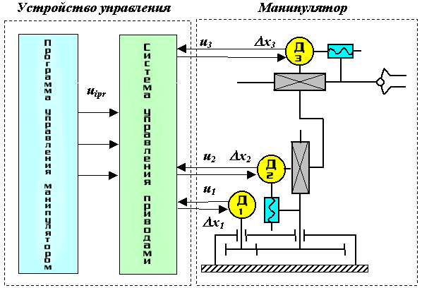 Механизм этого манипулятора соответствует цилиндрической системе координат. В этой системе звено 1 может вращаться относительно звена 0 (относительное угловое перемещение j10), звено 2 перемещается по вертикали относительно звена 1 (относительное линейное перемещение S21) и звено 3 перемещается в горизонтальной плоскости относительно звена 2 (относительное линейное перемещение S32). На конце звена 3 укреплено захватное устройство или схват, предназначенный для захвата и удержания объекта манипулирования при работе манипулятора. Звенья основного рычажного механизма манипулятора образуют между собой три одноподвижные кинематические пары (одну вращательную А и две поступательные В и С) и могут обеспечить перемещение объекта в пространстве без управления его ориентацией. Для выполнения каждого из трех относительных движений манипулятор должен быть оснащен приводами, которые состоят из двигателей с редуктором и системы датчиков обратной связи. Так как движение объекта осуществляется по заданному закону движения, то в системе должны быть устройства сохраняющие и задающие программу движения, которые назовем программоносителями. При управлении от ЭВМ такими устройствами могут быть дискеты, диски CD, магнитные ленты и др. Преобразование заданной программы движения в сигналы управления двигателями осуществляется системой управления. Эта система включает ЭВМ, с соответствующим программным обеспечением, цифроаналоговые преобразователи и усилители. Система управления, в соответствии с заданной программой, формирует и выдает на исполнительные устройства приводов (двигатели) управляющие воздействия ui. При необходимости она корректирует эти воздействия по сигналам Dxi, которые поступают в нее с датчиков обратной связи. Функциональная схема промышленного робота показана на рисунке: