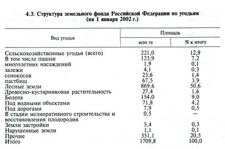 В составе участков земельной собственности, землевладений и землепользовании выделяют отдельные земельные угодья, т. е. участки (массивы) земли, планомерно и систематически используемые для определенных производственных целей, имеющие качественные различия природных, естественно-исторических и других свойств. Угодья подразделяют на сельскохозяйственные (пашня, многолетние насаждения, залежь, сенокосы, пастбища) и несельскохозяйственные (леса, кустарники, болота, застроенные территории и др.). На вид использования угодий определенное влияние оказывают их природные факторы и свойства. Поэтому выделяют не только виды, но и подвиды угодий (например, закочкаренные, закустаренные, переувлажненные пастбища). Кроме вышеперечисленных, могут быть и неиспользуемые угодья (поли гоны отходов, свалки, овраги, пески, территории консервации и др.) (табл. 4.3.).