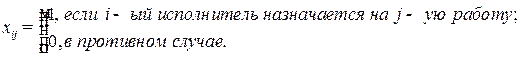 - ой работы. Необходимо так назначить исполнителей на работы, чтобы добиться максимальной полезности при условии, что каждый исполнитель может быть назначен только на одну работу и за каждой работой должен быть закреплен только один исполнитель. Для составления математической модели введем неизвестные