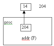Фактический параметр, используемый в copy-out, должен быть переменной. Подпрограмме передается адрес фактического параметра, который она сохраняет. Формальный параметр использует временную локальную переменную. Когда выполнение подпрограммы завершено, значение F копируется в переменную А, на которую указывает сохраненный адрес.