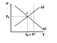Кейнсианская экономическая теория оспаривает существование такого механизма саморегулирования. На основе эмпирических данных, полученных в период Великой Депрессии, Д. Кейнсу удалось доказать, что полная занятость в нерегулируемой экономике может возникнуть только случайно. Равновесие спроса и предложения (см. рис.), как правило, не совпадает с полной занятостью ресурсов: в точке А устанавливается равенство AD = AS, однако равновесный объем производства Y0 < Y.(рис.3.1.1.)