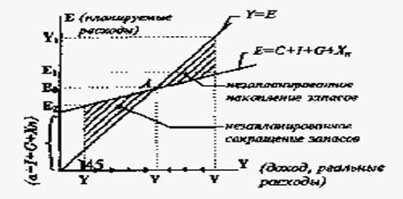 Очевидно, что линия планируемых расходов пересечет линию, на которой реальные и планируемые расходы равны друг другу (то есть линию Y = Е) в какой-то одной точке А (см. рис.3.2.1.). Приведенный чертеж получил название креста Кейнса. На линии Y = Е всегда соблюдается равенство фактических инвестиций и сбережений. В точке А, где доход равен планируемым расходам, достигается равенство планируемых и фактических инвестиций и сбережений, то есть устанавливается макроэкономическое равновесие.