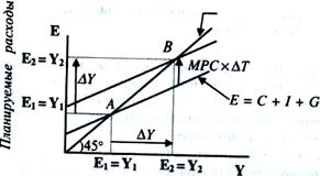 Аналогичное мультипликативное воздействие на равновесный уровень дохода окажет и снижение налогов Т. Если налоговые отчисления снижаются на ∆T, то располагаемый доход Yd = Y- Т возрастает на величину ∆Т(см. рис. 4.2.1). Потребительские расходы соответственно увеличиваются на величину ∆Т*Ь, что сдвигает вверх кривую планируемых расходов и увеличивает равновесный объем производства Y} до Y2 на величину