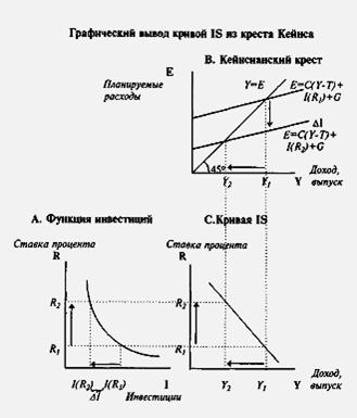 Кривая IS - кривая равновесия на товарном рынке. Она представляет собой геометрическое место точек, характеризующих все комбинации Y и R, которые одновременно удовлетворяют тождеству дохода, функциям потребления, инвестиций и чистого экспорта. Во всех точках кривой IS соблюдается равенство инвестиций и сбережений. Термин IS отражает это равенство (Investment - Savings).