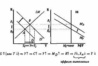 Если госрасходы G увеличиваются, то совокупные расходы и доход возрастают, что приводит к увеличению потребительских расходов С. Увеличение потребления, в свою очередь, увеличивает совокупные расходы и доход, причем с эффектом мультипликатора. Увеличение Y способствует росту спроса на деньги, так как в экономике совершается большее количество сделок. Повышение спроса на деньги при их фиксированном предложении вызывает рост процентной ставки R. Повышение процентных ставок снижает уровень инвестиций и чистого экспорта Хn. Падение чистого экспорта связано также с ростом совокупного дохода Y, который сопровождается увеличением импорта. В итоге рост занятости и выпуска, вызванный стимулирующей фискальной политикой, оказывается частично элиминированным за счет вытеснения частных инвестиций и чистого экспорта.