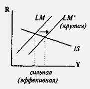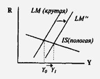 Стимулирующая денежно-кредитная политика наиболее эффективна при сочетании относительно крутой LM и пологой IS. В этом случае и снижение процентных ставок весьма существенно и коэффициенты dun значительны. Поэтому прирост Y, равный (YoYj), относительно велик.(рис.6.2.2.)