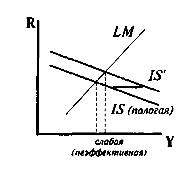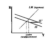 динамике процентных ставок, то есть коэффициенты d и n очень велики. В этом случае даже незначительное увеличение R вызовет большое снижение и Хn и поэтому общий пророст Y будет мал. Графически эта ситуация иллюстрируется относительно пологой кривой IS (см.рис.6.2.3.) Наклон кривой LM в данном случае имеет второстепенное значение.