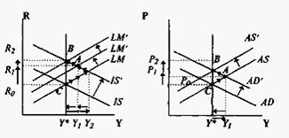 В условиях инфляции спроса экономические агенты постепенно корректируют свое поведение: повышаются ставки номинальной заработной платы. Это увеличивает средние издержки на единицу продукции и сокращает прибыль фирм. Постепенно фирмы начинают снижать свой выпуск и кривая AS медленно смещается влево. Так как предложение денег все время относительно снижается, то ставка процента все время возрастает от R0 до R2. В точке В устанавливается долгосрочное макроэкономическое равновесие при более высоком уровне цен и процентных ставок, чем в точке С, и изменении структуры экономики в пользу государственного сектора. Уровень производства равен потенциальному.